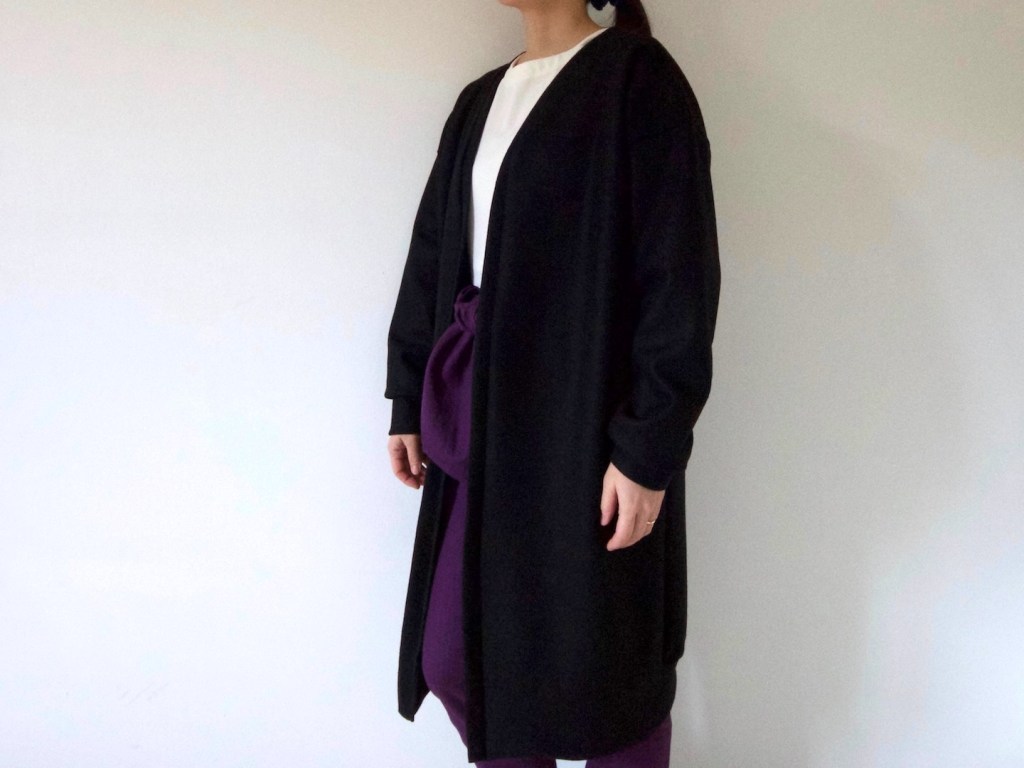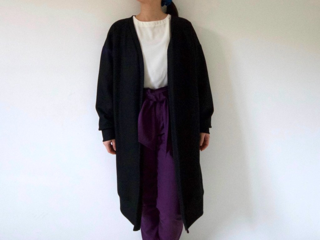J’ai trouvé le tissu sur le site de magasin tissu qui s’appelle ‘Fab-Fabric’ à Fukuoka au Japon. C’est de la laine maille et pressée donc il ne se détend pas beaucoup mais un peu plus extensible que le tissu tissé. C’est recommandé de réaliser une veste ou un blouson mais j’ai fait un gilet. C’est chaud et confortable. Je le porte seul quand il fait moins froid et je le porte sous mon manteau quand il fait très froid. C’est pratique et chic en même temps (mon avis).