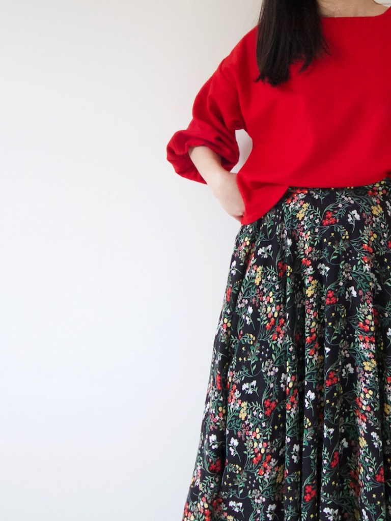 Cette jupe, Claudie de Fibre Mood 12 est une jupe pour le niveau 2 étoiles (moyen?). C’était facile à confectionner et le résultat est formidable. J’aime la forme. Cette fluidité crée le joli mouvement pour les petites fleurs de jardin du tissu.