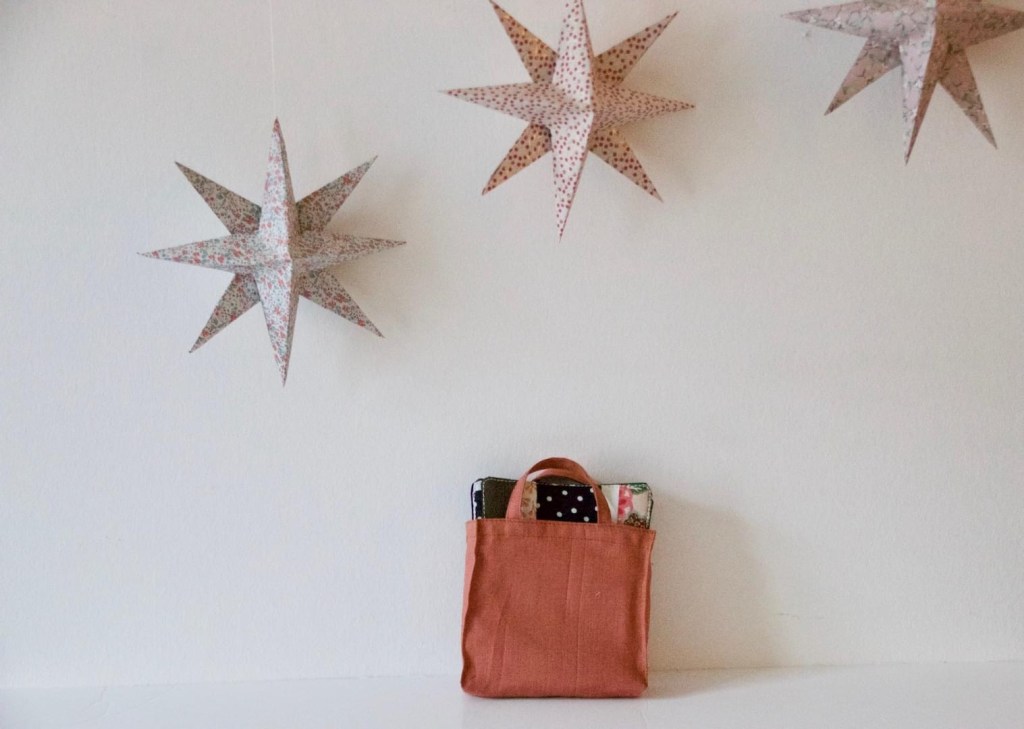 Il y a un sac qui va avec mes sous-verres. J’adore le confectionner! Normalement, j’ utilise du lin (extérieur) et du coton (intérieur) des bouts de tissus pour les sacs!