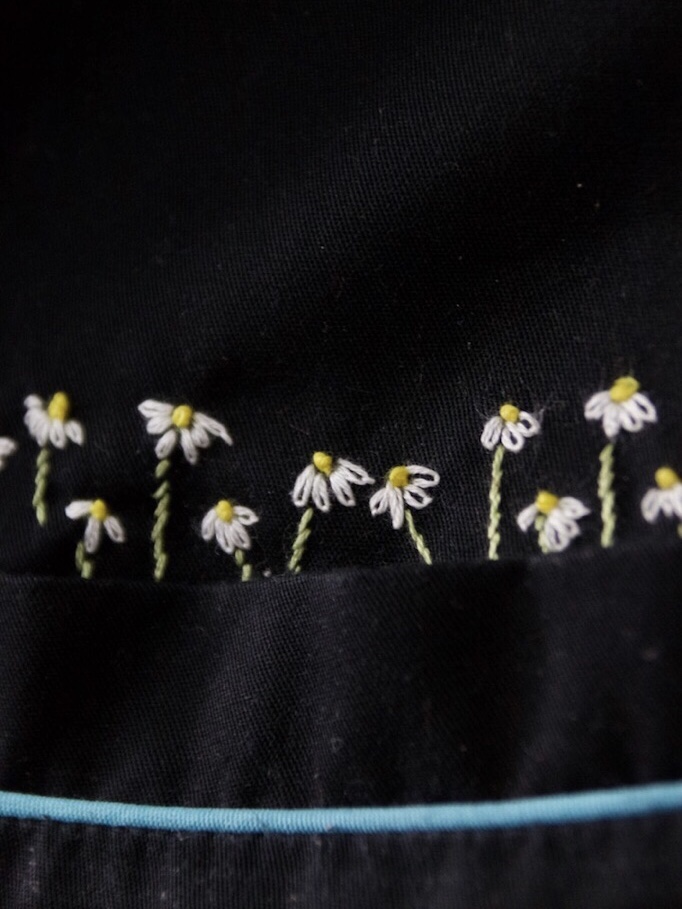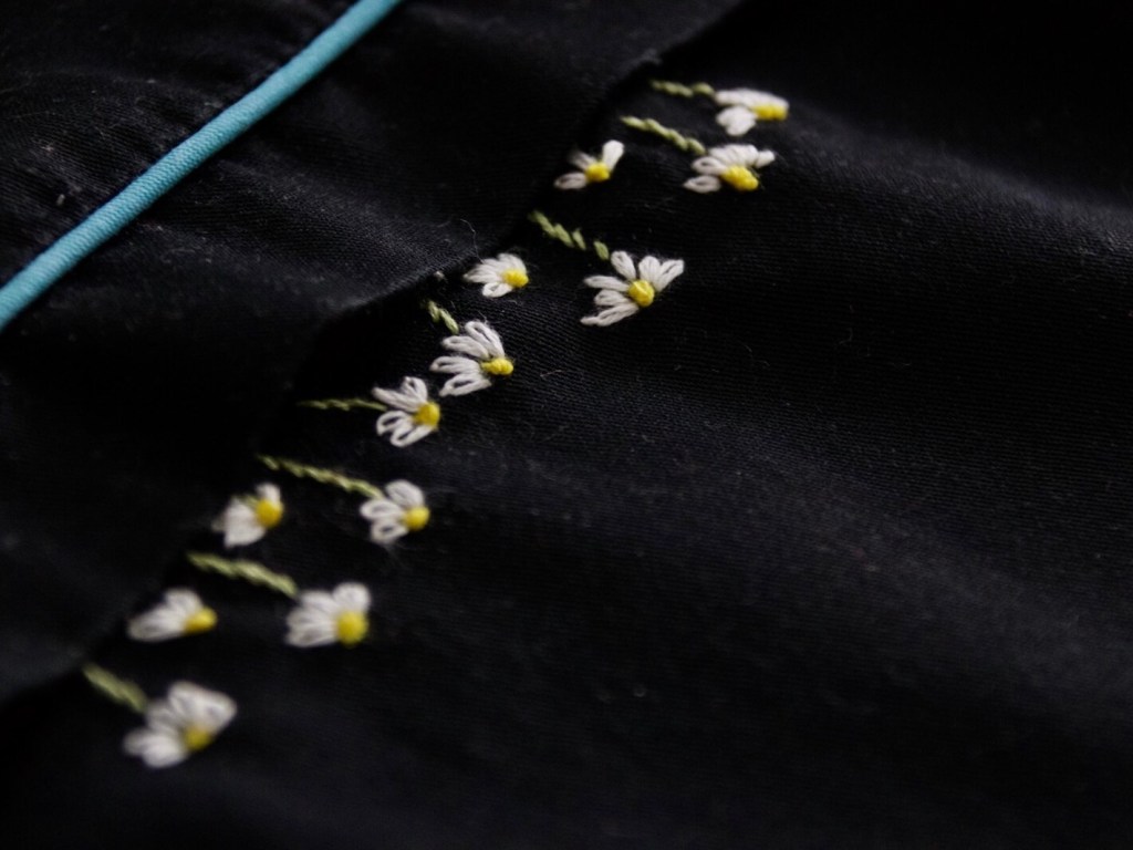 Je suis très contente de l’avoir brodé! Ça fait longtemps que je fais de la broderie. Cette fois, j’ai choisi des pâquerettes.