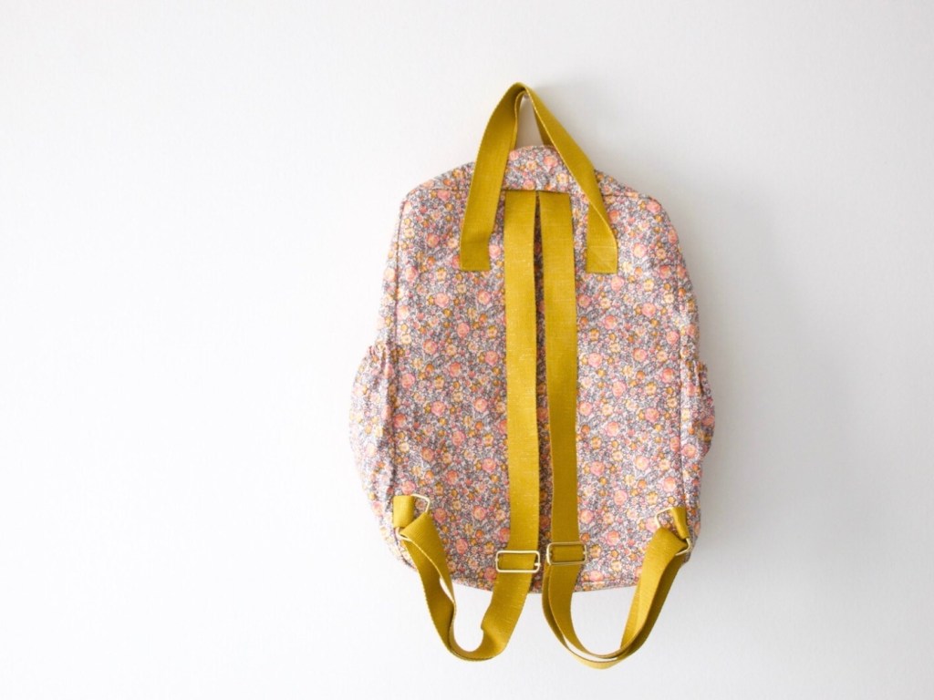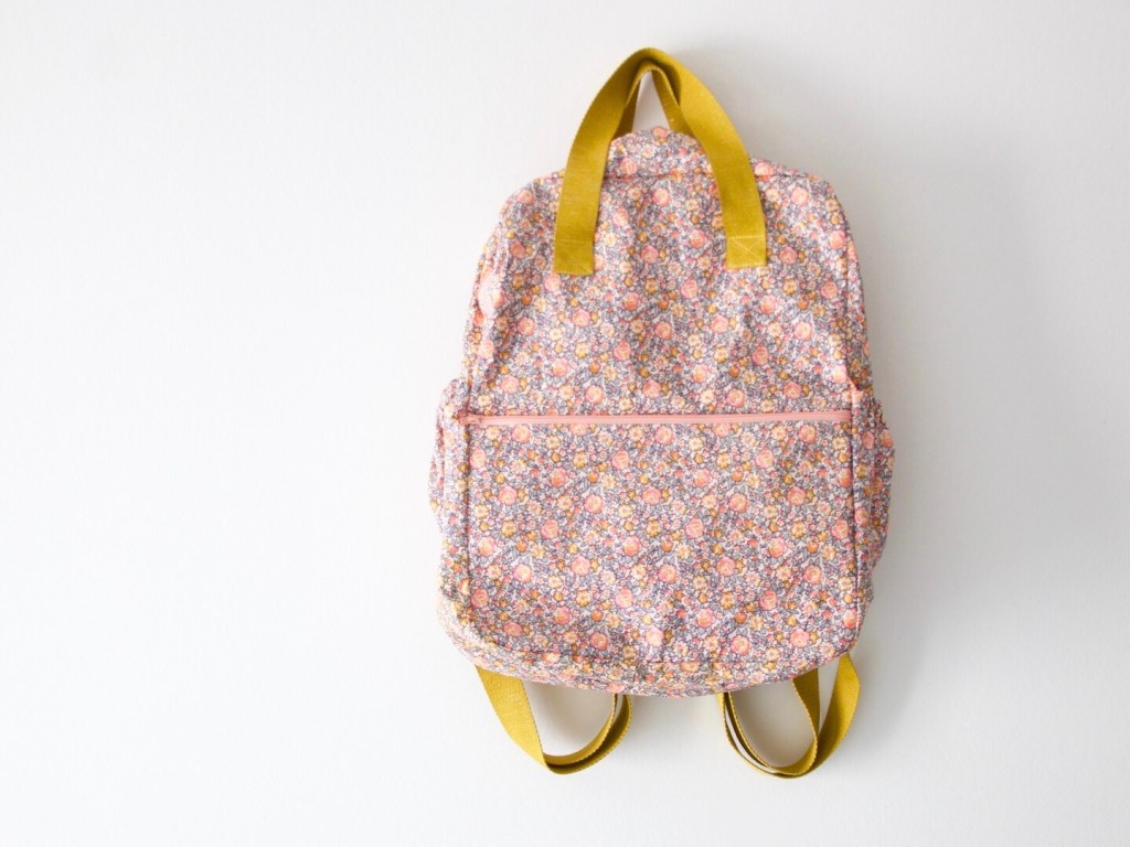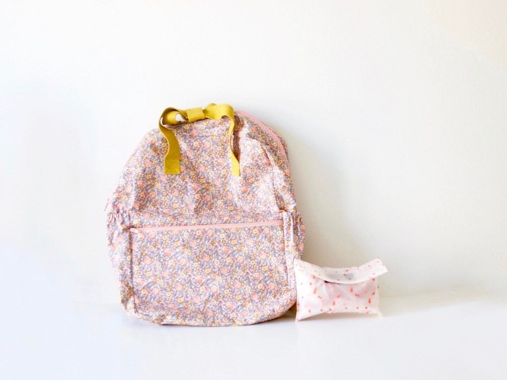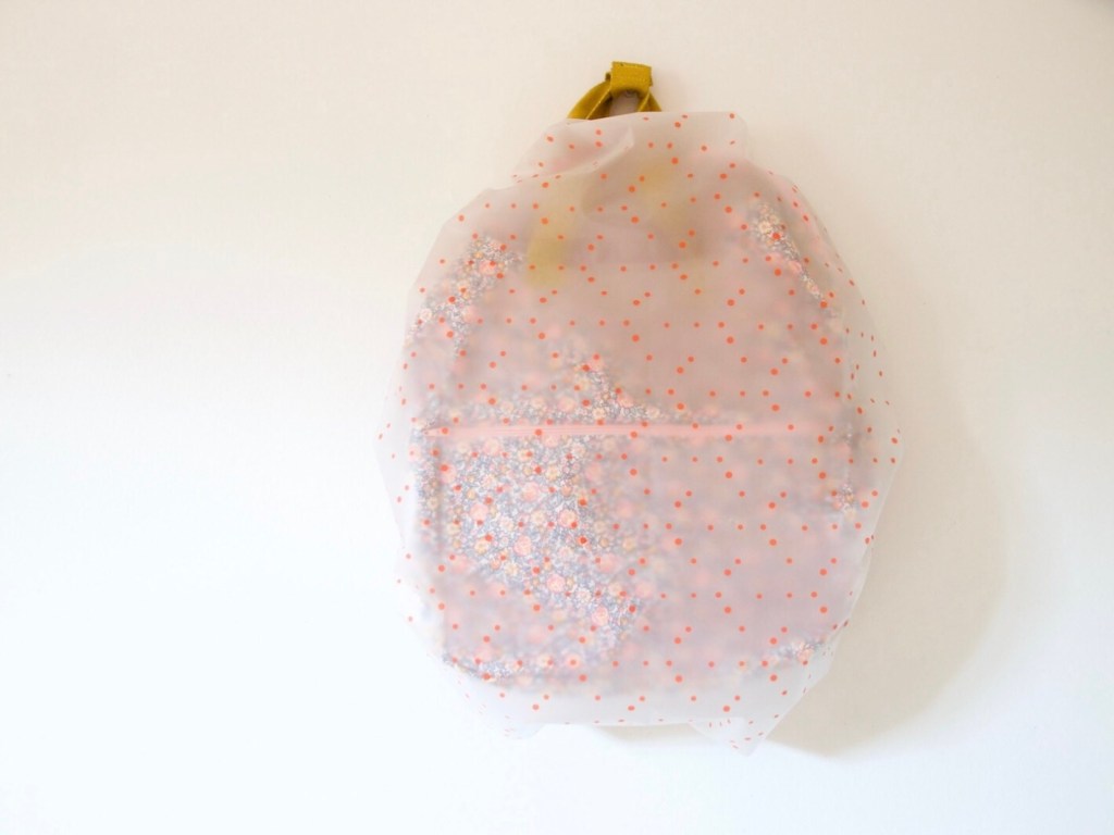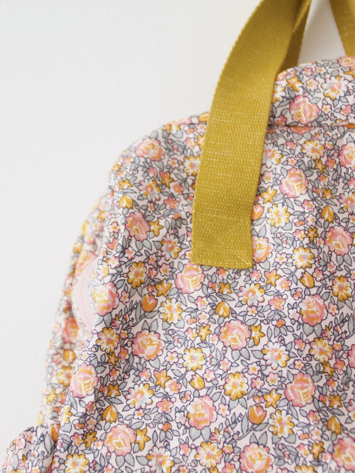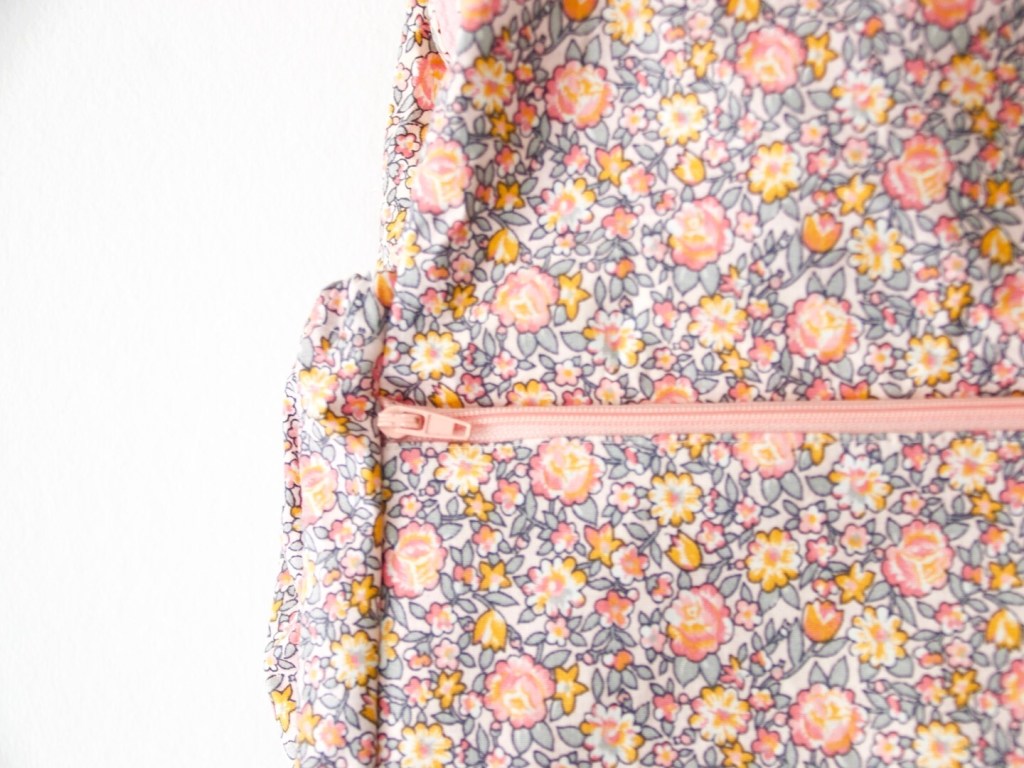 Pour notre nièce, j’ai fait un sac à dos motif fleurs. Ce tissu est du coton qui a été traitée plastifiée sur surface. Par contre, ce n’est pas imperméable. Du coup, j’ai confectionné une housse imperméable pour couvrir le sac.