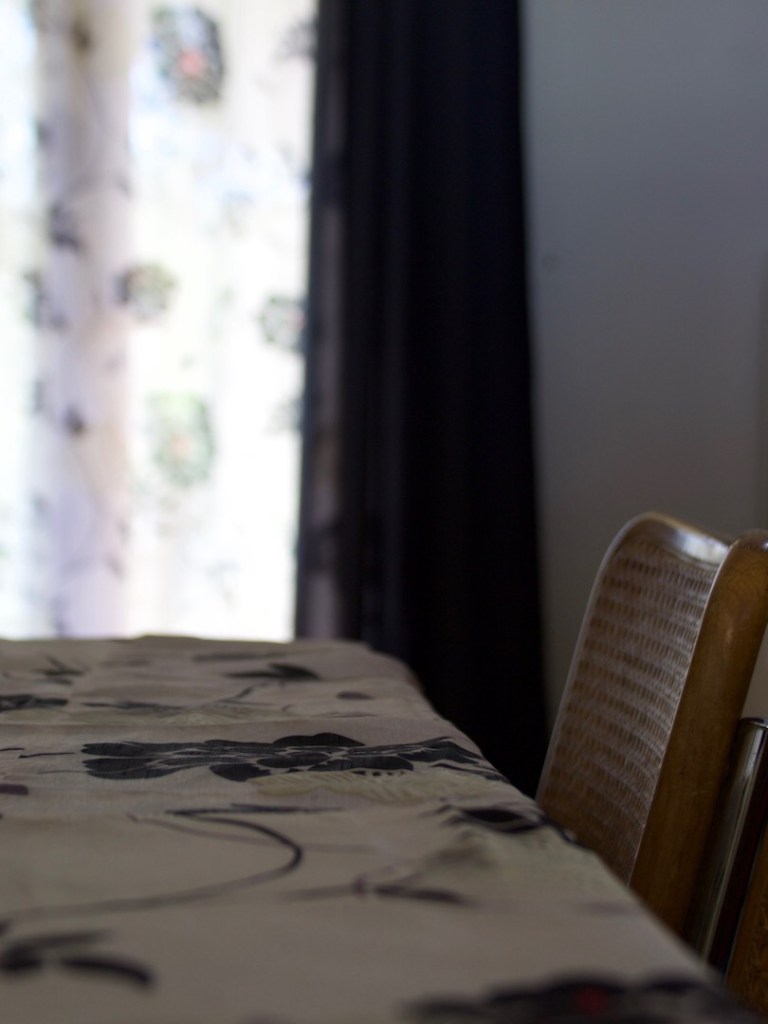 J’ai fait des rideaux avec le tissu que j’ai amené du Canada. Il y a longtemps, j’aimerais bien réaliser les rideaux avec ce tissu. Nous avons une nape qui est fait avec le même tissu. Ça complete. C’est un peu nostalgie aussi.