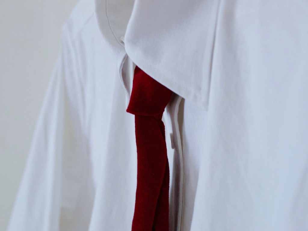 Bref, c’est fini et mon fils est content. C’est difficile à voir mais la cravate est le velours en bordeaux. C’est confectionné en biais…. Ce n’était pas facile. Honnêtement, je ne peux pas vous montrer le derrière…