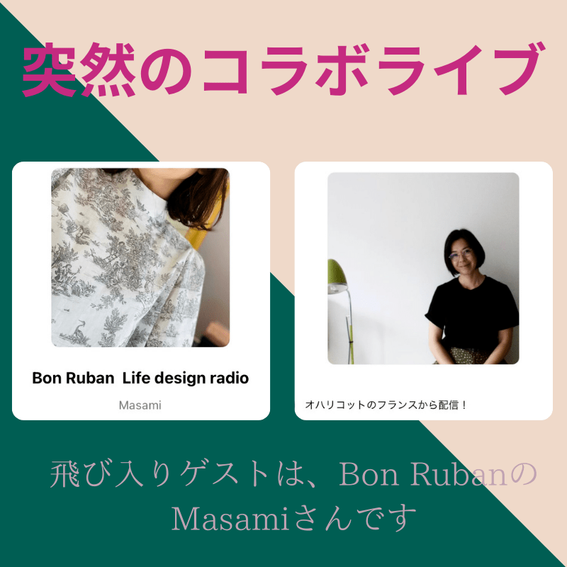 本日は、突然のご招待を快く受けて下さった、アパレルブランド Bon Ruban の Masamiさんと朝から楽しいコラボライブをさせて頂きました♪