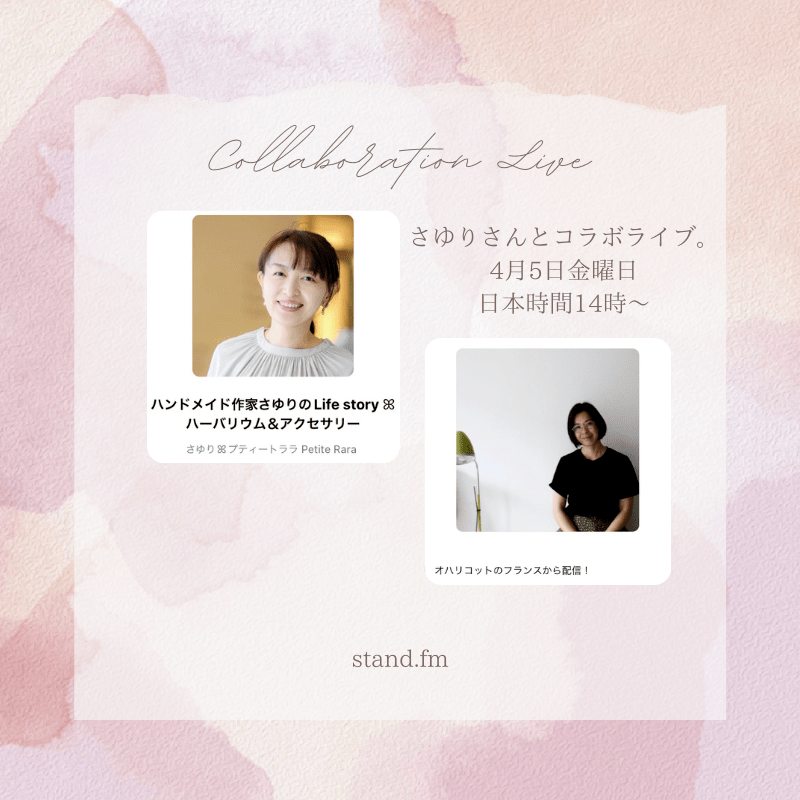4月5日日本時間の2時(フランス時間朝7時より)、ハンドメイド作家のさゆりさんとコラボライブをスタンドFMで致します。